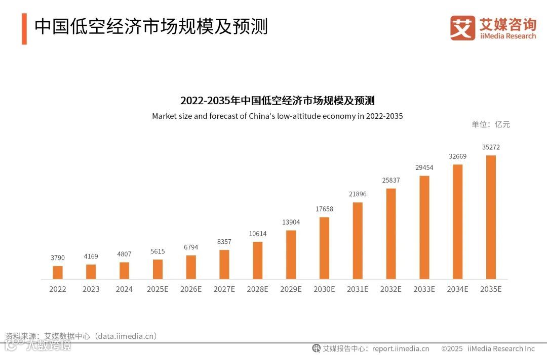数据显示,2022-2024年中国低空经济市场规模数据呈现上升趋势,2025年中国低空经济市场规模预计达5615亿元,预测2035年有望突破3.5万亿元。艾媒咨询分析师认为,2024年是低空经济发展的元年,随着政策的落实和相关措施的不断落地,低空经济将在未来呈现爆发式增长。