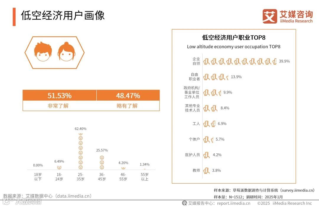 iiMedia Research(艾媒咨询)数据显示,本次调研的用户中,所有用户均对低空经济有所了解。其中,用户年龄多分布在25-35岁之间,占比为62.40%。在职业TOP8中,企业白领占比较大,达39.9%。
