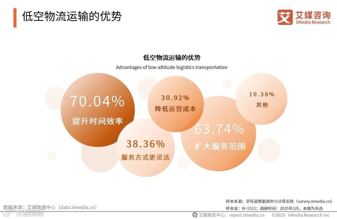 iiMedia Research(艾媒咨询)数据显示,超七成的低空经济受访者表示低空物流运输的优势在于可以有效地提升时间效率,实现快速运输。超六成的受访者则认为相比于传统物流,低空物流可以扩大服务范围,通过空中运输到达陆地运输无法到达的地点。艾媒咨询分析师认为,低空物流运输展现出了无可比拟的速度优势和服务范围,为城市带来了更高效的物流圈。
