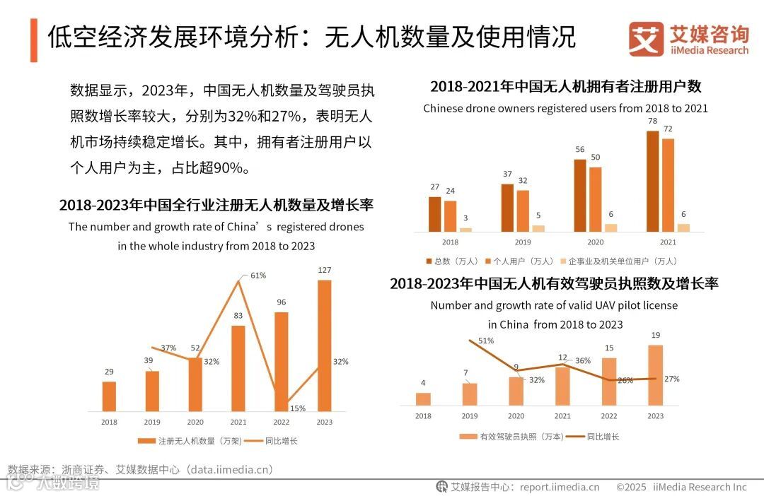 数据显示,2023年,中国无人机数量及驾驶员执照数增长率较大,分别为32%和27%,表明无人机市场持续稳定增长。其中,拥有者注册用户以个人用户为主,占比超90%。