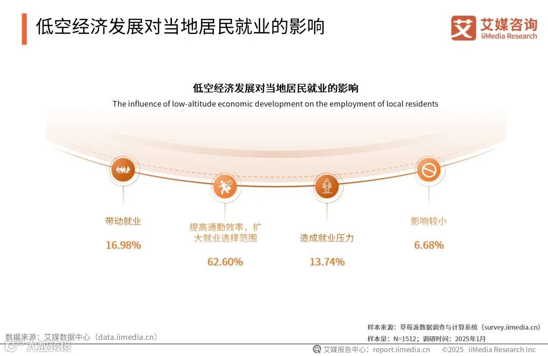 iiMedia Research(艾媒咨询)数据显示,超六成的低空经济受访者认为低空经济的发展可以有效提高通勤效率,扩大就业选择范围。艾媒咨询分析师认为,随着低空载人航天技术运用范围扩大及成本降低,居民可以通过低空飞行载具获得更高效的通勤效率,为社会创造出更多的就业机会选择。