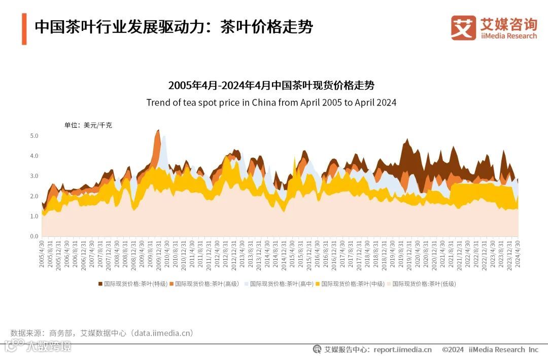 在二级市场,茶叶可按品质高低分为低级、中级、高中、高级和特级。从茶叶国际现货市场来看,2019年下半年到2024年4月,特级茶叶价格波动幅度较大,其他品级的茶叶价格相对平稳。艾媒咨询分析师认为,特级茶叶的产量比较容易受到生长环境、采摘时节、制作工艺等因素的影响,而消费者对于特级茶叶的需求变动不大,当供需不平衡时,特级茶叶的价格会有较为频繁的波动。