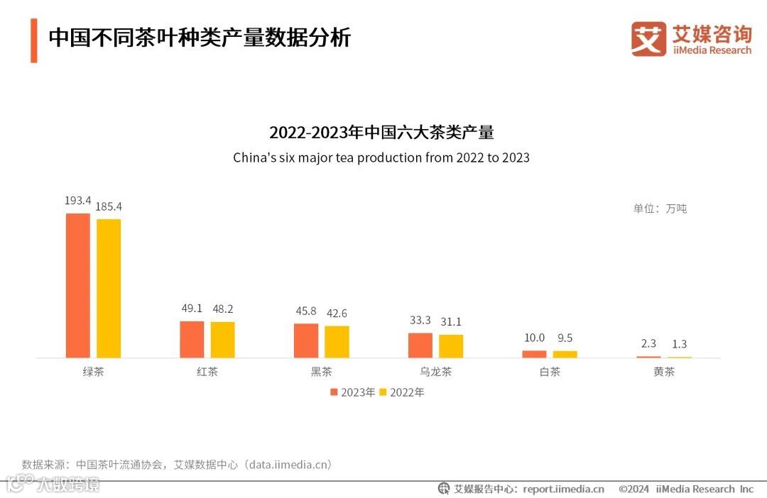 数据显示,2023年中国六大茶类的产量均有不同幅度增长。其中,全国绿茶产量193.4万吨,比增8.0万吨,增幅4.3%;红茶49.1万吨,比增0.9万吨,增幅1.9%;黑茶45.8万吨,比增3.2万吨,增幅7.4%;乌龙茶33.3万吨,比增2.15万吨,增幅6.9%;白茶10.0万吨,比增0.56万吨,增幅6.0%;黄茶2.3万吨,比增1.0万吨,增幅78.4%。