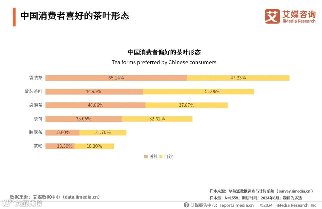 iiMedia Research(艾媒咨询)数据显示,2024年中国消费者在送礼时最喜爱的茶叶形态是袋装茶(65.14%),自饮时则最喜爱散装茶叶(51.06%),粉状和胶囊状这两种形态的茶叶在市场上接受程度不高。艾媒咨询分析师认为,自饮时讲究较少,散装茶叶即开即泡,适合于随性的居家自饮场景。茶饼包装较为大气,易于携带、运输,且由于送礼多以普洱茶为主,而普洱茶的加工又多以能够发挥其“越陈越香”特色风味的饼茶技术为主,故茶饼在送礼用途上更受欢迎。