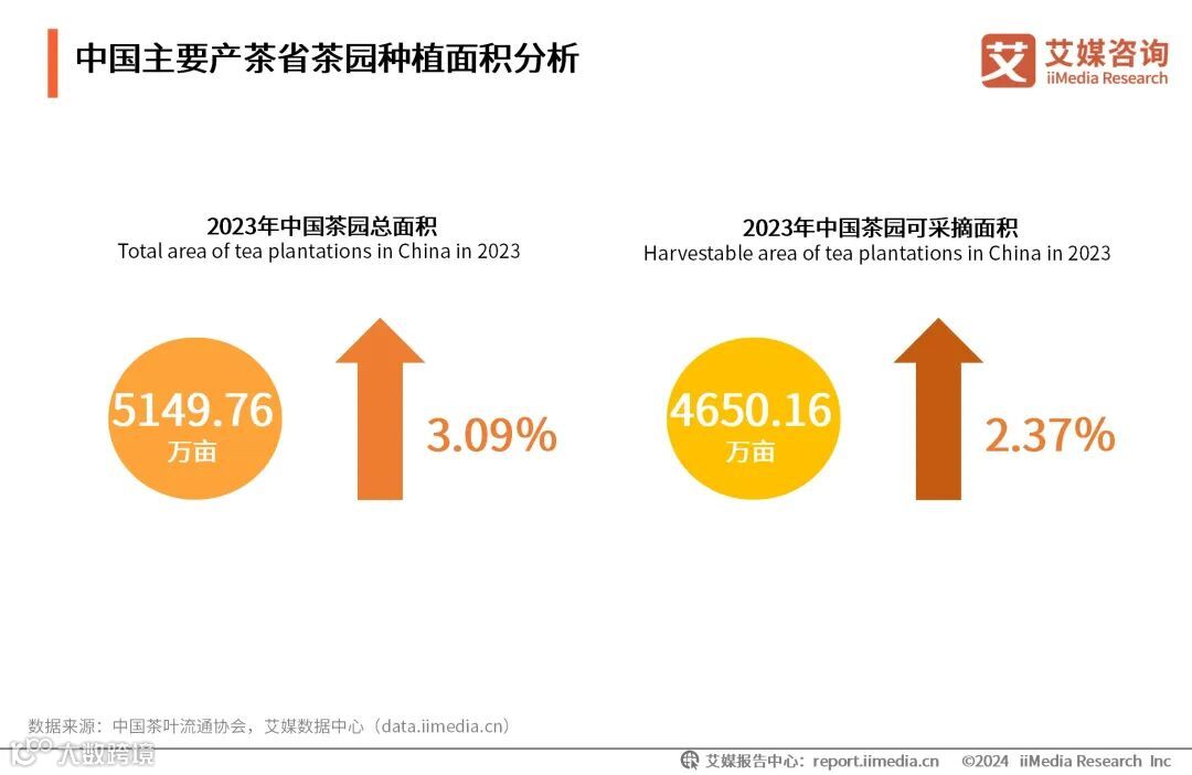 数据显示,2023年,中国18个主要产茶省(自治区、直辖市)的茶园总面积为5149.76万亩,同比增加154.36万亩,增幅3.09%。其中,可采摘面积4650.16万亩,同比增加110.27万亩,增幅2.37%。茶园面积超过500万亩的省份有4个,分别是云南省、贵州省、四川省、湖北省。