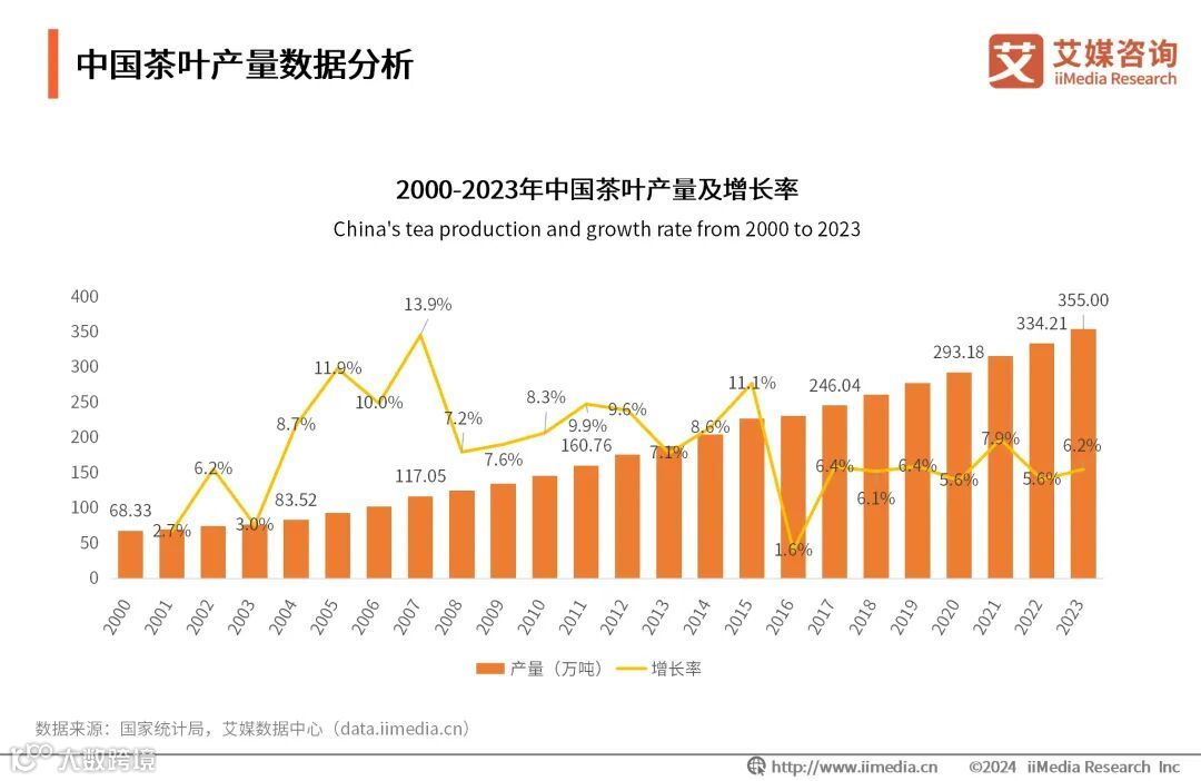 iiMedia Research(艾媒咨询)数据显示,2023年中国茶叶产量已达到355万吨,比2022年增长20.79万吨,同比增长6.2%。在茶叶产量不断增加的同时,中国茶叶行业市场规模也保持连年增长态势,2023年市场规模达到3511.8亿元,预计2028年可达到5309.6亿元。