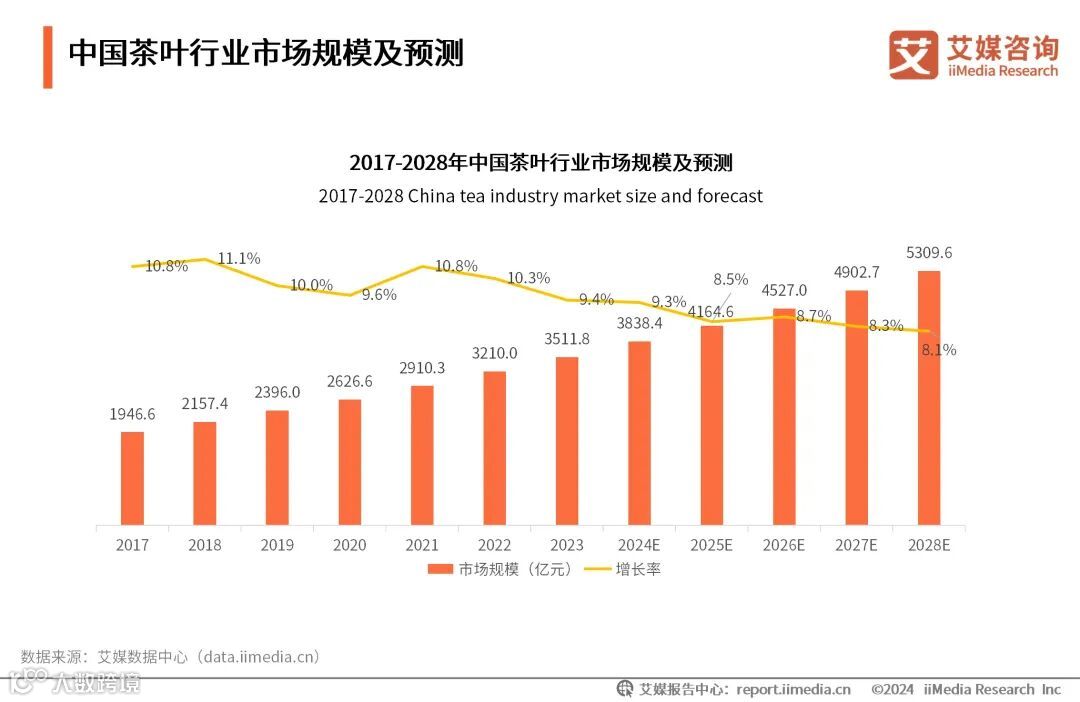 中国茶叶行业市场规模保持连年增长态势,2023年市场规模达到3511.8亿元,预计2028年可突破5000亿元,达到5309.6亿元。艾媒咨询分析师认为,中国是全球最大的产茶国和茶叶消费市场,茶叶行业未来将长期保持平稳向好发展的趋势。