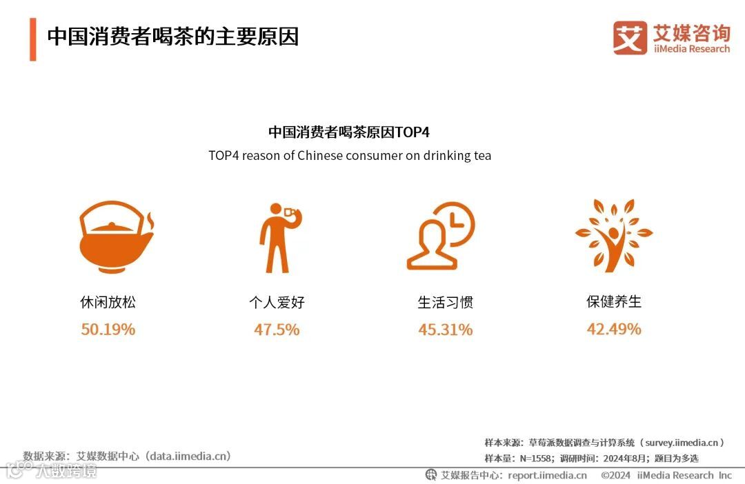 iiMedia Research(艾媒咨询)数据显示,50.19%的中国消费者表示喝茶的主要原因是休闲放松,47.5%的消费者是出于个人爱好而喝茶,有45.31%的消费者表示喝茶已经成为一种生活习惯,42.49%的消费者则出于保健养生的理由选择喝茶。艾媒咨询分析师认为,喝茶已经逐渐成为不少现代人生活中的一部分,茶饮市场发展潜力巨大。