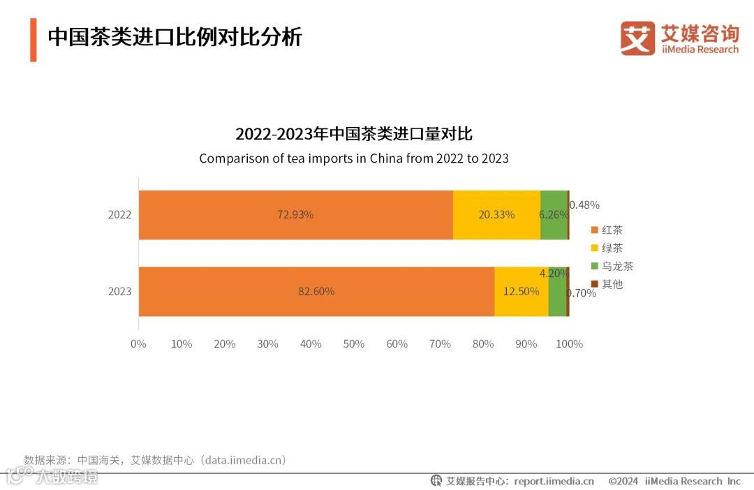 数据显示,2023年中国进口的茶叶仍然主要以红茶为主,占进口茶叶总量的82.60%。红茶作为中国进口量最多的茶叶,主要有两类,一类是来自印度和斯里兰卡的大吉岭、锡兰等知名大品牌红茶,这类茶以罐装、礼盒装为主,主要供追求精致生活的中产阶级消费。另外一类是大宗红茶,这类茶主要来自肯尼亚等非洲国家,价格相对低廉,进入国内市场后,主要以茶调饮和袋泡茶的形式流行于年轻消费者之间。