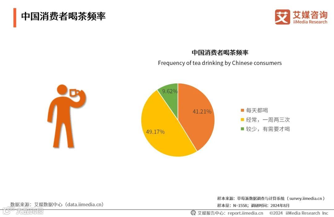 iiMedia Research(艾媒咨询)数据显示,中国消费者基本有着喝茶的习惯,保持每天喝茶习惯的消费者占41.21%,一周喝茶两三次的消费者占49.17%。艾媒咨询分析师认为,中国饮茶文化从古流传至今,在日常生活中广泛渗透,国人饮茶已成为一种普遍现象。加之当代人对于健康养生的需求不断上升,饮茶愉悦身心、滋养身体的益处让越来越多的消费者关注并选择饮茶。