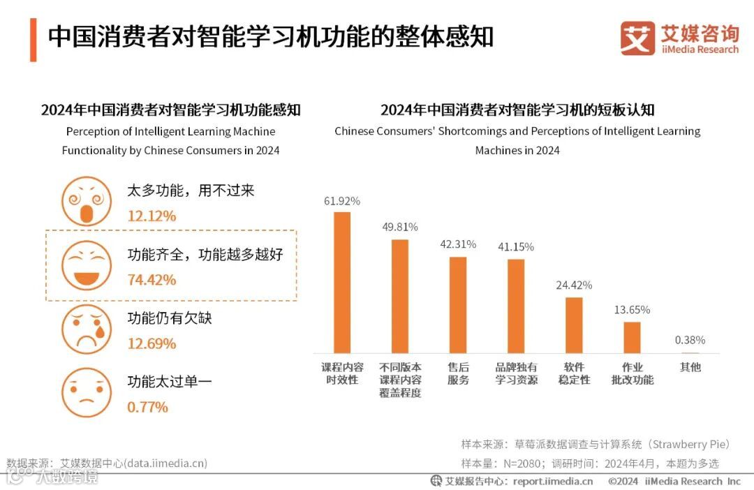 iiMedia Research(艾媒咨询)数据显示,超七成受访者表示市面上智能学习机功能齐全,且认为功能越多越好。超六成受访者认为智能学习机的课程内容时效性不高。艾媒咨询分析师认为,消费者对学习机功能较为满意,但对学习机的课程资源质量仍有更高的期望。