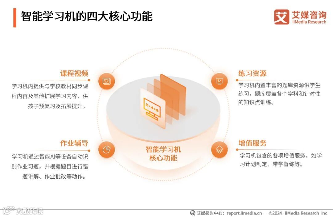 智能学习机是一种辅助学习电子产品,具有多种场景的学习功能,旨在帮助孩子更有效地学习。随着市场的变化及消费者的需求,智能学习机分为四大核心功能,分别为课程视频、练习资源、作业辅导功能以及购买后的增值服务等。