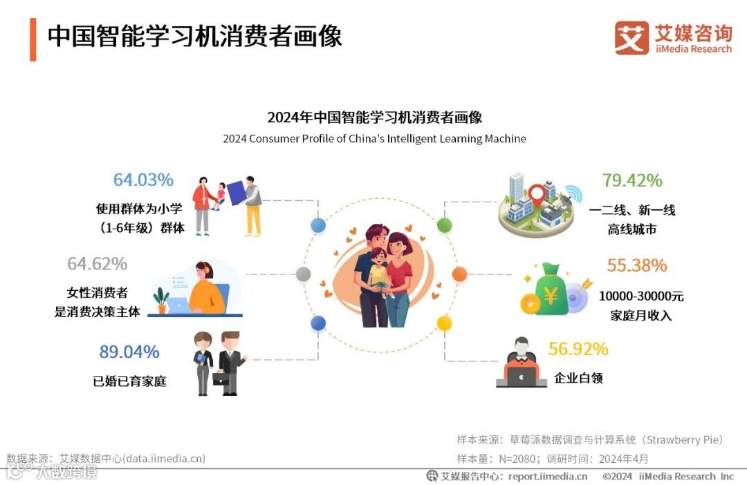 iiMedia Research(艾媒咨询)数据显示,中国智能学习机使用群体以小学生(64.03%)为主,多数是来自一二线城市(79.42%),其父母普遍职业为白领(56.92%)。艾媒咨询分析师认为,出于对子女教育的重视,企业白领类人群是学习机的核心消费者,且女性在消费决策中担任更积极的角色。