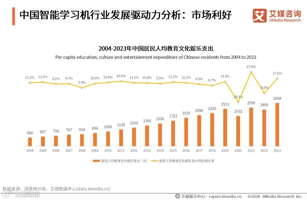数据显示,2004-2023年中国居民人均教育文化娱乐支出水平整体呈上升趋势,2023年中国居民人均教育文化娱乐支出为2904元,同比增长17.6%。艾媒咨询分析师认为,随着中国家长对孩子教育的重视,在教育文化娱乐方面的支出将持续升高,为相关教育产业提供了夯实的发展基础。
