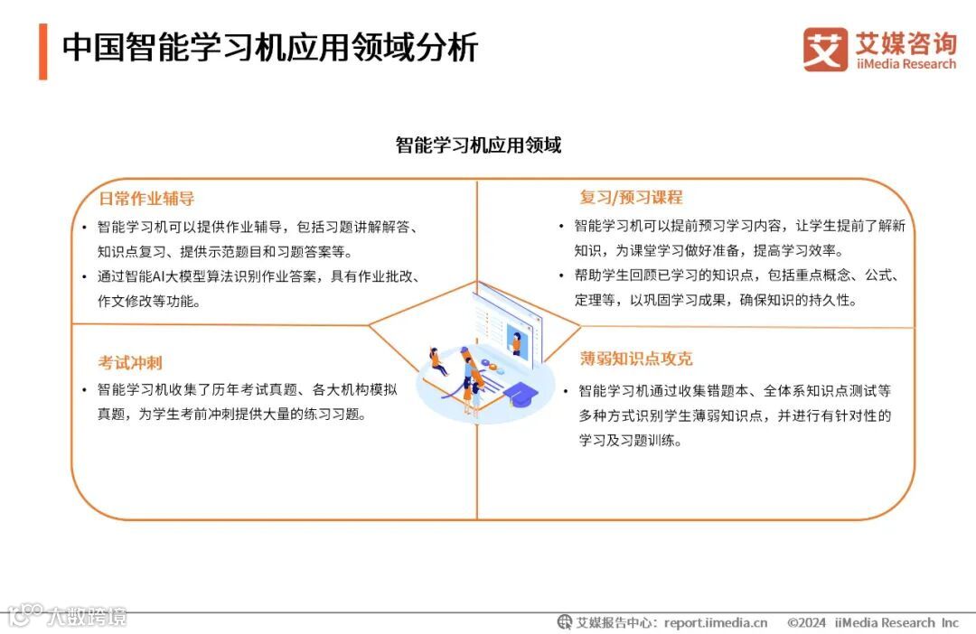 智能学习机作为新型的教学辅助工具之一,常用于学生的日常作业辅导、复习/预习课程、考试冲刺、薄弱点知识攻克等领域,同时为学生提供个性化的学习支持和辅导服务。艾媒咨询分析师认为,智能学习机正处于发展中阶段,随着其功能和服务的完善,智能学习机将成为学生主流的学习辅助工具之一。