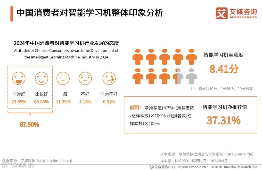 iiMedia Research(艾媒咨询)数据显示,近九成受访者表示看好中国智能学习机行业的未来发展,受访者对中国智能学习机产品整体印象较为满意,达8.41分,对智能学习机的NPS推荐值达37.31%。艾媒咨询分析师认为,目前市场消费者对智能学习机行业较为看好且使用体验较为满意。
