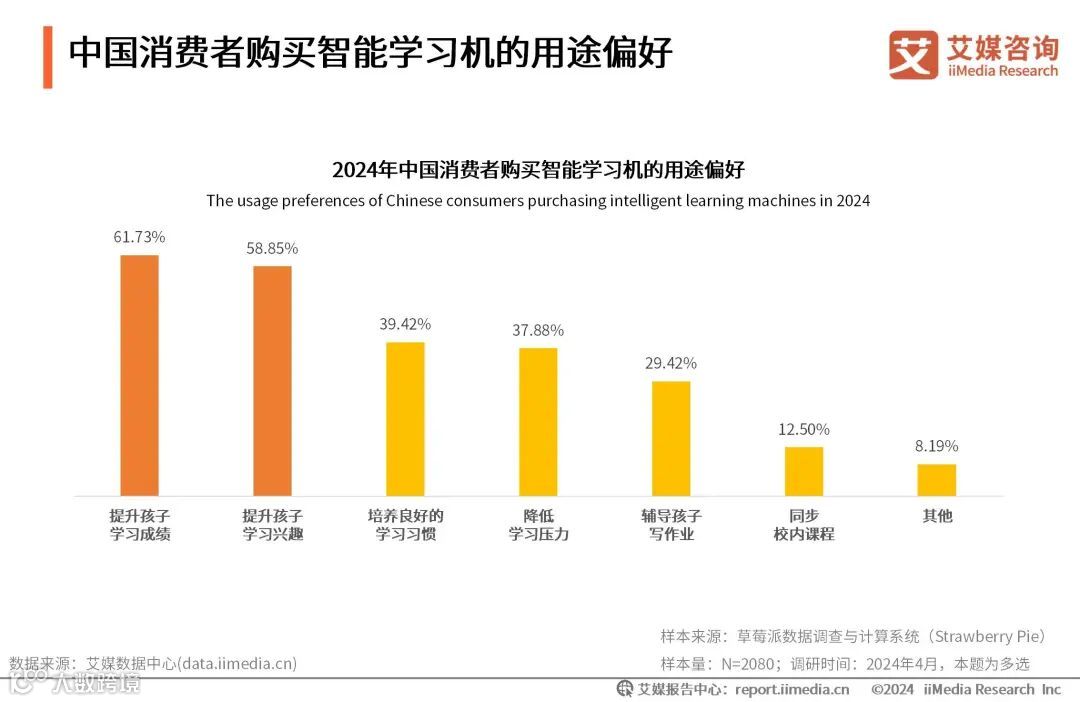 iiMedia Research(艾媒咨询)数据显示,超六成的受访者购买智能学习机是为了提升孩子学习成绩,近六成的受访者购买智能学习机是为了提升孩子学习兴趣,而同步校内课程为主要目的的相对较少,占12.50%。艾媒咨询分析师认为,中国家长较为重视孩子的学习成绩,对教育市场相关的学习辅导产品需求较高。