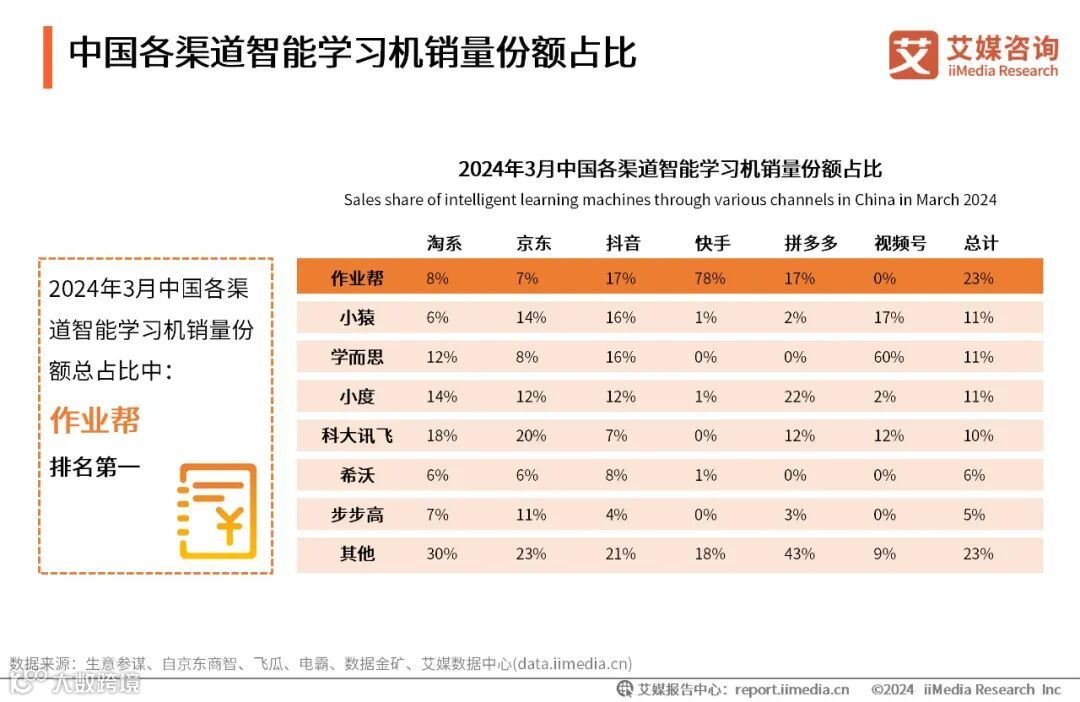 数据显示,在淘系、京东、抖音、快手、拼多多和视频号等渠道中,2024年3月作业帮智能学习机销量份额总计占比排名第一,达23%,其中快手渠道作业帮智能学习机销量较大,达78%。小猿、学而思和小度智能学习机销量份额总计占比排名第二,均为11%。