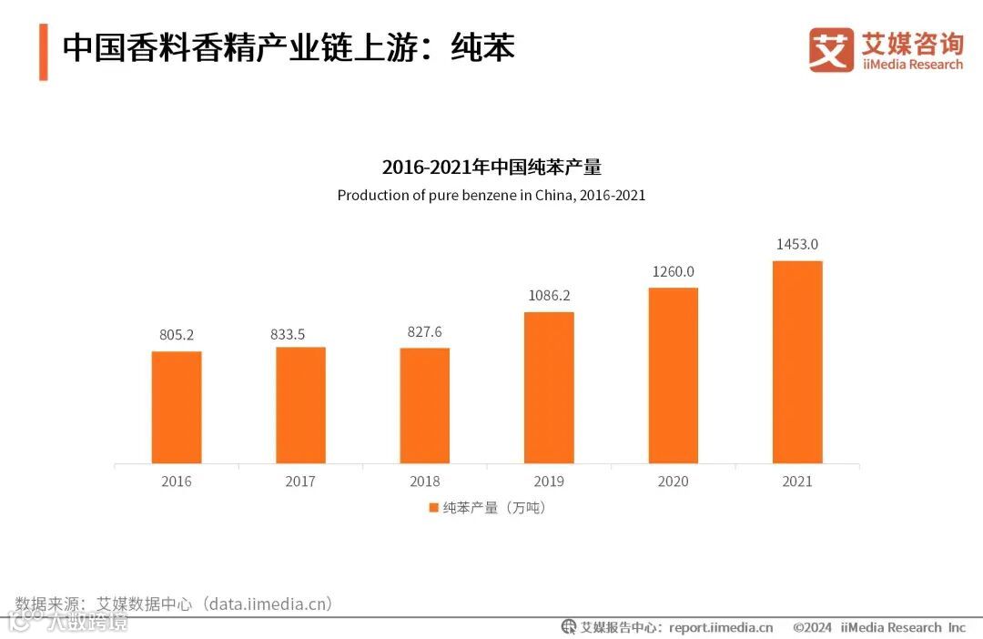 纯苯是制作香料香精的基本化工原料之一。iiMedia Research(艾媒咨询)数据显示,2021年中国纯苯产量为1453.0万吨。近年来,随着芳烃产业快速发展及技术的不断成熟,中国纯苯与甲苯产能大幅增长,产品质量提升,保障香料香精行业的上游原料产品供应,利于行业的稳定发展。