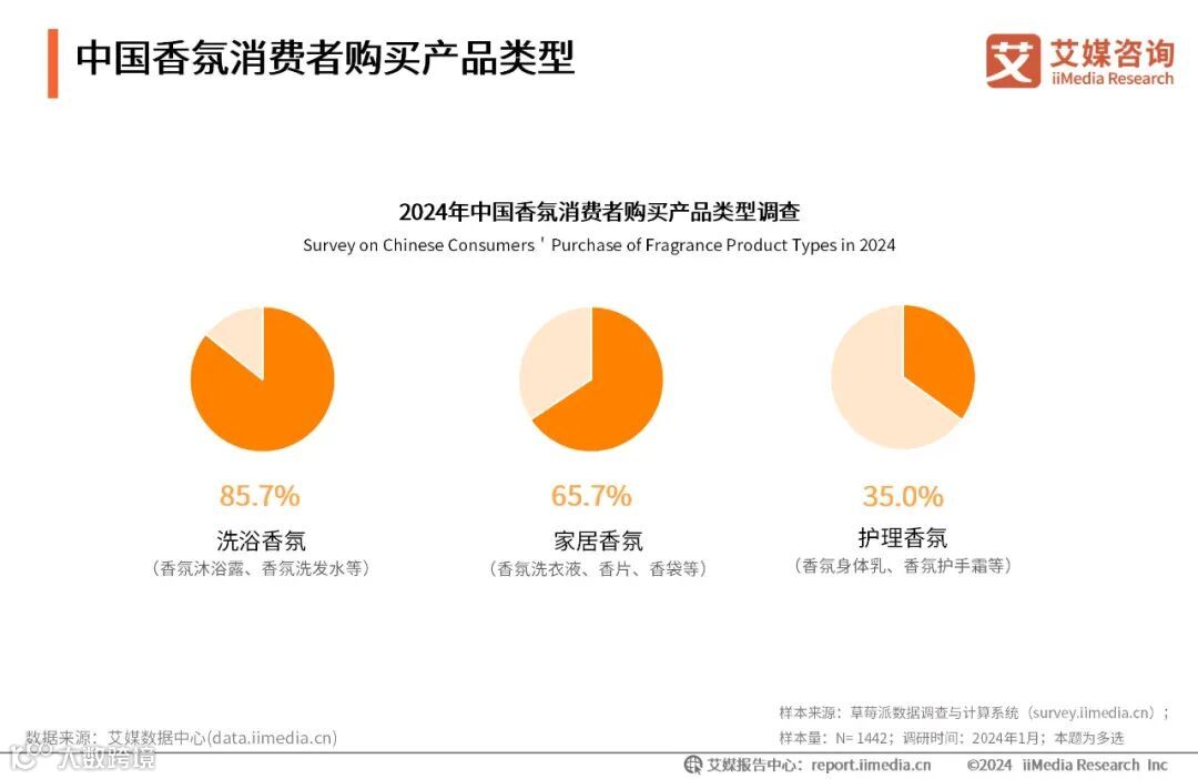 iiMedia Research(艾媒咨询)数据显示,2023年,中国香氛消费市场中,超八成消费者购买了洗浴香氛类产品,超六成消费者购买了家居香氛类产品,购买护理香氛类产品的消费者超过三成。艾媒咨询分析师认为,香氛赛道中,日常使用的洗浴香氛主导着香氛市场消费,追求品质生活的家居香氛也具有一定的市场潜力。