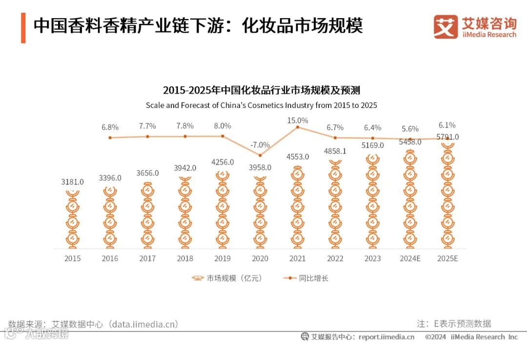 赋予产品独特的香味是香料香精在化妆品中最基本的作用,最重要的作用是通过不同的原料及成分的组合,来满足不同消费者的肤质、功效需求。iiMedia Research(艾媒咨询)数据显示,2023年中国化妆品市场规模约为5169.0亿元,同比增长6.4%,2025年有望增至5791.0亿元。化妆品行业的增长为日化香精市场的发展提供了良好的机遇。