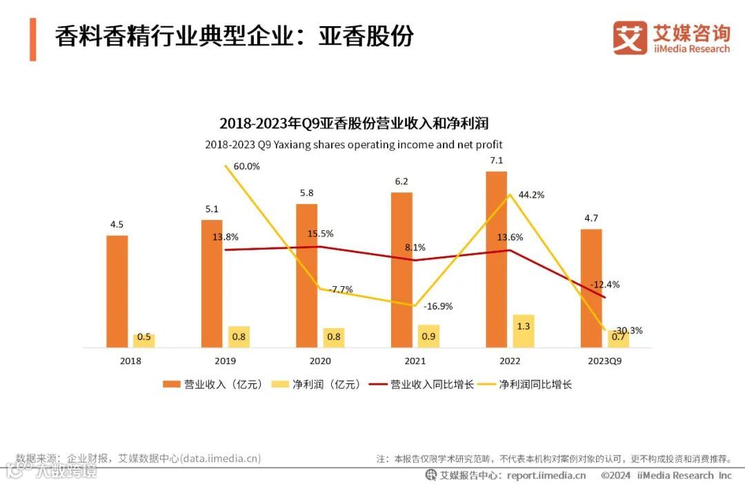数据显示,2023年前三季度,亚香股份营业收入为4.7亿元,净利润为0.7亿元,营收和净利润同比下降,且降幅较大,主要是由下游需求短期降低与主要产品产能降低等原因所致。未来,预计泰国生产基地建设完成后,随着下游需求的回升,企业营收状况将有所好转。