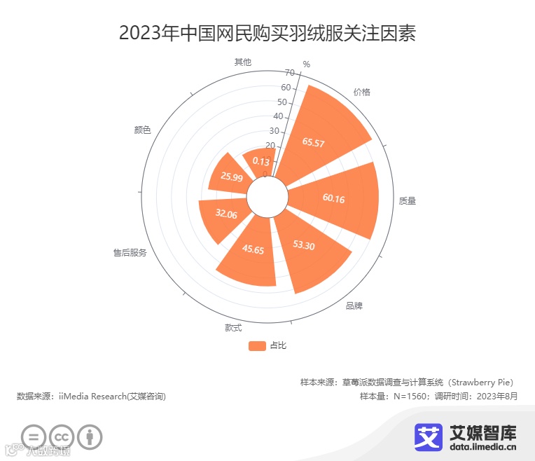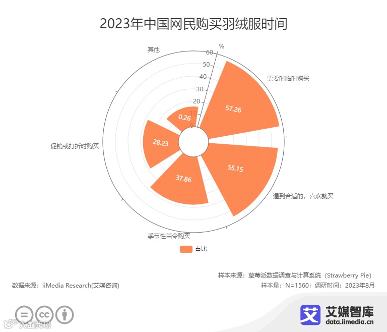 iiMedia Research(艾媒咨询)数据显示,在2023年中国网民购买羽绒服时间调查中,57.26%的消费者表示选择需要时临时购买,这种购买行为受需求紧迫性和对寒冷天气预期的影响较大;55.15%的消费者表示遇到合适的,喜欢就买,这部分消费者可能受个人喜好和时尚趋势的影响,更注重羽绒服的款式和设计;37.86%的消费者选择当季购买;28.23%的消费者可能受到价格敏感度和促销活动的影响,会选择促销或打折时购买,通常出现在电商购物节或者反季促销中,“不是没钱买,而是反季节购买更具性价比”。
