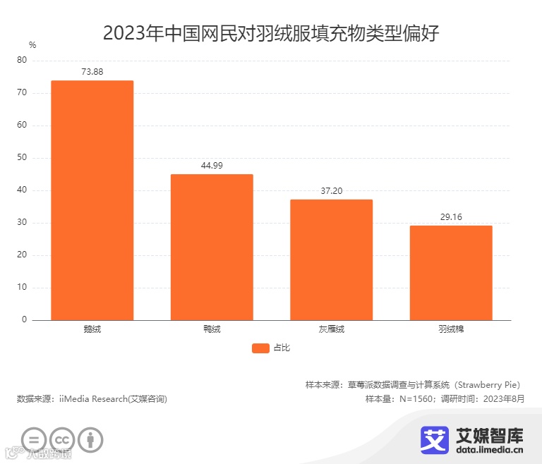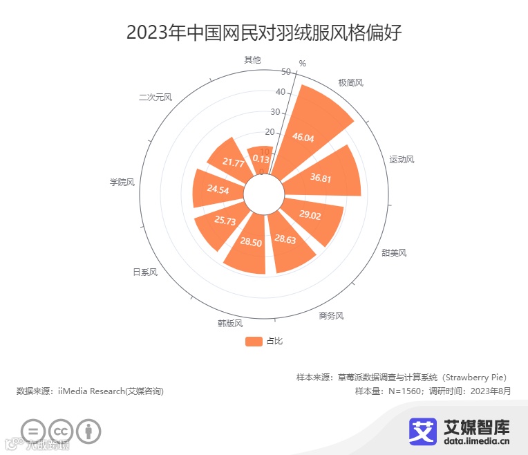 iiMedia Research(艾媒咨询)数据显示,在2023年中国网民对羽绒服款式偏好调查中,76.25%的消费者选择中长款,40.37%的消费者选择短款,38.26%的消费者选择长款,0.13%的消费者选择其他。中长款羽绒服在中国消费者中最为受欢迎,其次是短款和长款羽绒服。不同款式的羽绒服都有其特点和适用人群,喜爱程度亦和当时流行风尚有关。