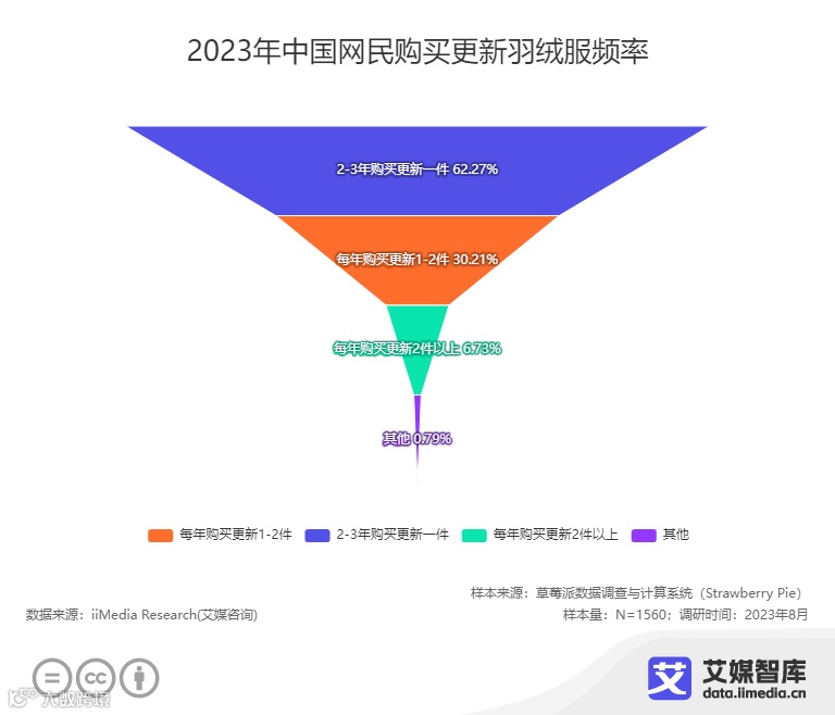 iiMedia Research(艾媒咨询)数据显示,在2023年中国网民购买更新羽绒服频率调查中,62.27%的消费者选择2-3年购买更新一件,这表明该部分消费者对羽绒服的需求相对稳定,他们可能更注重羽绒服的质量和耐用性,而不是频繁购买新的款式;30.21%的消费者选择每年购买更新1-2件,这意味着这部分消费者对羽绒服的需求相对较高,他们可能认为羽绒服具有良好的保暖性能和时尚性,因此愿意定期更新羽绒服;6.73%的消费者选择每年购买更新2件以上,这部分消费者对羽绒服的需求更高,可能更注重时尚性和多样性,愿意每年购买新的款式。