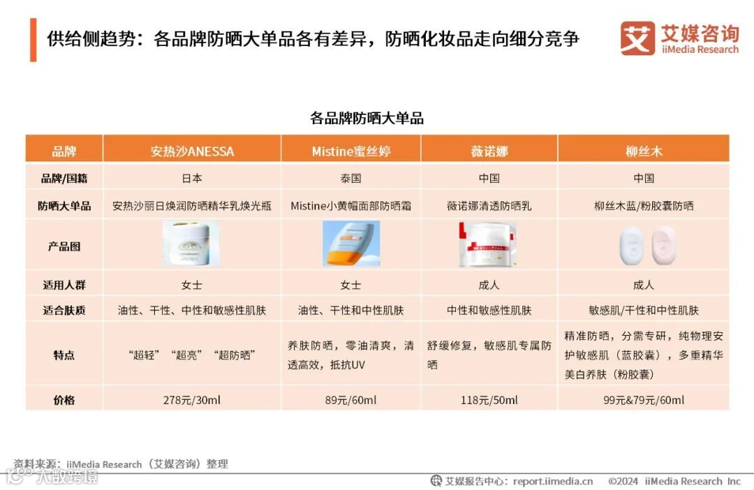 供给侧趋势:各品牌防晒大单品各有差异,防晒化妆品走向细分竞争