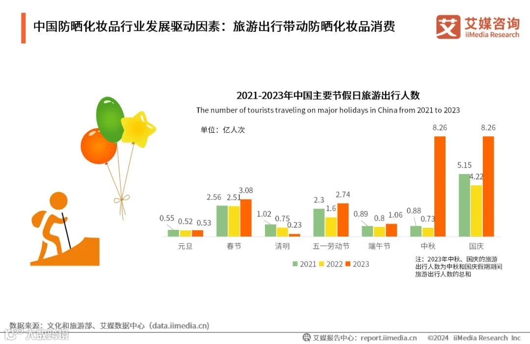 随着旅游业的回暖,人们的出行意愿增强,公众对于户外活动的需求显著提升,节假日旅游人次大幅增加。数据显示,2023年,中国中秋和国庆假期期间国内旅游出游人数达到8.26亿人次,同比增长了71.3%,旅游业的强劲复苏对防晒化妆品行业的发展起到了积极的推动作用。