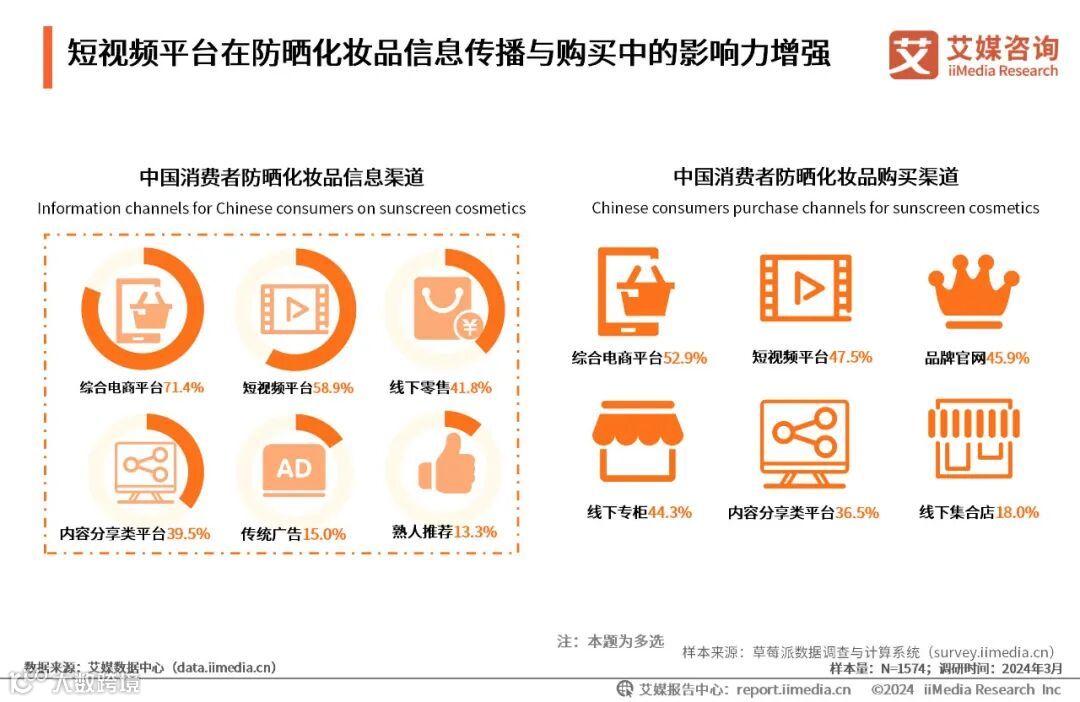 iiMedia Research(艾媒咨询)调研数据显示,在防晒化妆品信息获取渠道方面,71.4%的消费者主要通过电商平台了解产品和相关资讯,短视频平台占比达58.9%。在购买渠道上,综合电商平台(52.9%)和短视频平台(47.5%)成为了消费者购买防晒化妆品的主要途径。艾媒咨询分析师认为,短视频“直播带货”模式的兴起使得商品的流通渠道得以扩充,其不仅在信息传播上占据主导地位,也在商品销售中扮演重要角色。