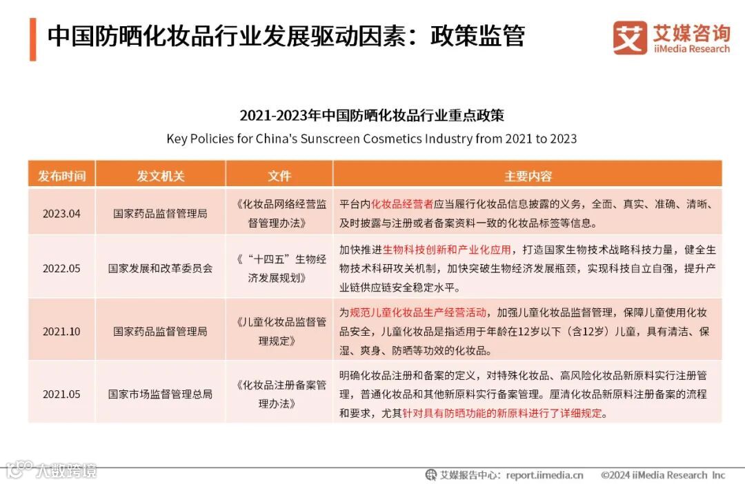 2021年5月1日,中国首部专门针对化妆品注册备案管理的部门规章《化妆品注册备案管理办法》开始施行后,配套政策相继出台。2023年4月,国家药品监督管理局发布的《化妆品网络经营监督管理办法》,要求平台内化妆品经营者应当履行化妆品信息披露的义务。政府的政策引导和支持将进一步规范中国防晒化妆品行业健康发展。