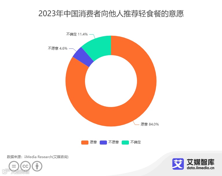 iiMedia Research(艾媒咨询)数据显示,在2023年中国消费者向他人推荐轻食餐的意愿中,84.0%消费者会选择愿意,11.4%消费者会选择不确定,仅4.6%消费者选择不愿意。可见就目前而言,轻食行业存在着较大比例的“自来水顾客”,邀新机制的雏形初显。