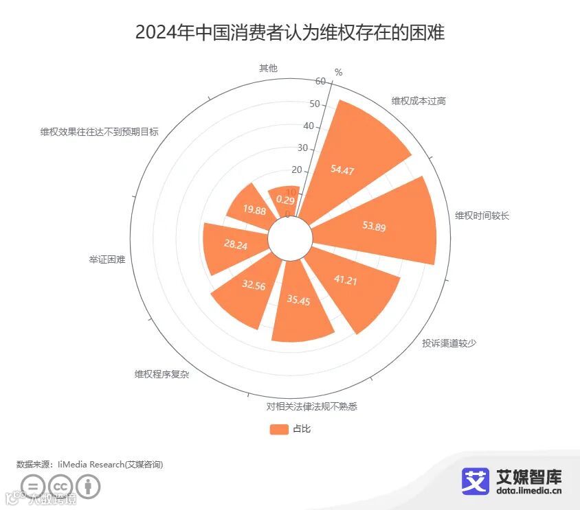 在维权过程中,大多消费者会遇到各式各样的问题:有54.47%的消费者认为维权成本过高;53.89%的消费者认为维权时间较长;41.21%的消费者认为投诉渠道较少;有35.45%的消费者认为对相关法侓法规不熟悉;有32.56%的消费者会选择维权程序复杂。