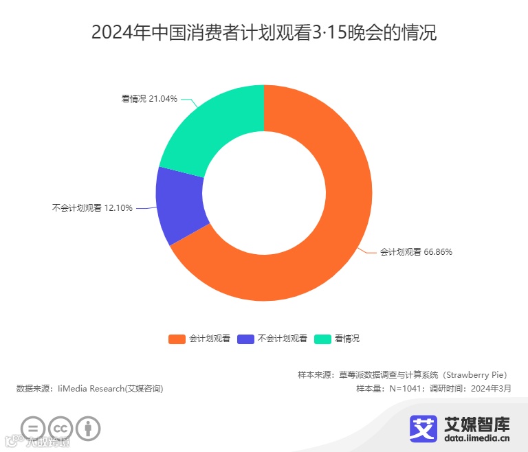 我国的3·15晚会首播于1991年,时至今日已经34届了。iiMedia Research(艾媒咨询)调研数据显示,当前有77.81%的中国消费者有关注或观看往年3·15晚会。今年的3·15晚会,有66.86%的消费者表示会计划观看,21.04%消费者则表示看情况。