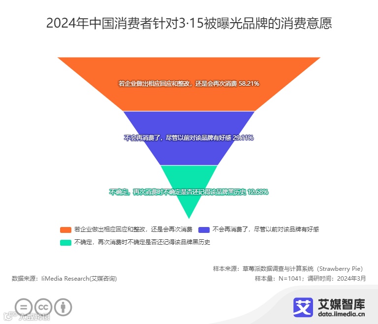 关于3·15被曝光品牌的后续消费意愿,58.21%的消费者认为若企业做出相应回应和整改,还是会再次消费;29.11%的消费者则表示不会再消费了,尽管以前对该品牌有好感;还有12.68%的消费者表示不确定,再次消费时不确定是否还记得该品牌黑历史。