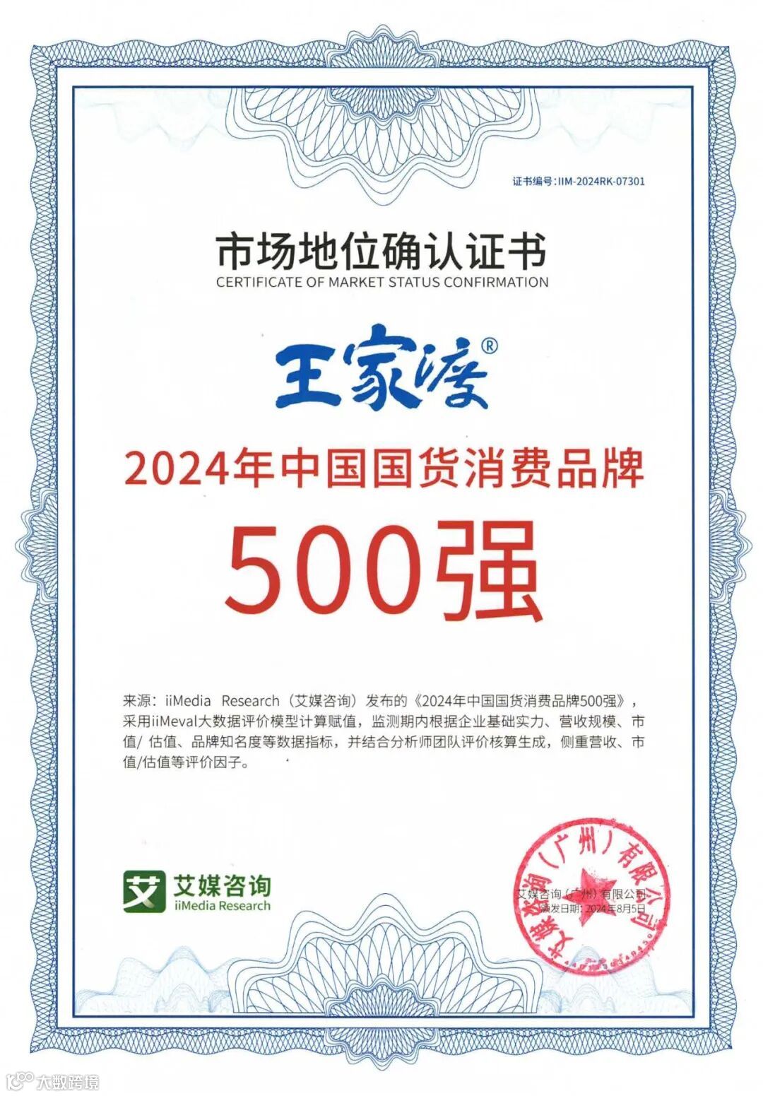 全球新经济产业第三方数据挖掘和分析机构iiMedia Research(艾媒咨询)发布《2024年中国国货消费品牌500强》,此榜单依托艾媒自主研发的“中国移动互联网大数据挖掘与分析系统(CMDAS)”(广东省重大科技专项,项目编号:2016B010110001),采用iiMeval大数据评价模型计算赋值,监测期内根据企业基础实力、营收规模、市值/ 估值、品牌知名度等数据指标,并结合分析师团队评价核算生成,侧重营收、市值/估值等评价因子。王家渡品牌凭借其卓越的技术创新能力和深远的品牌影响力,在众多国货品牌中脱颖而出,金榜指数高达74.29,荣耀跻身总榜第200名。这一殊荣不仅是对王家渡在川味食品领域深耕细作、持续创新的高度认可,更是对其品牌价值与市场地位的充分肯定。