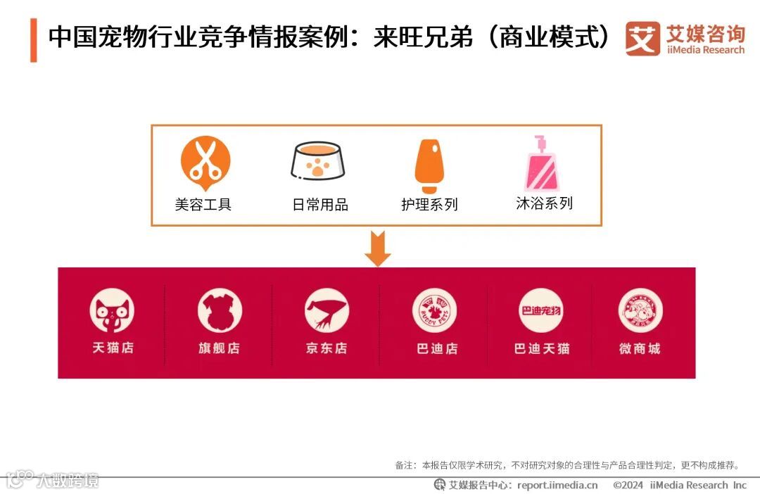 来旺兄弟的宠物用品板块拥有美容工具、日常用品、护理系列、沐浴系列四个品类,通过天猫店、旗舰店、京东店、巴迪店、巴迪天猫、微商城等各个线上店铺售卖。艾媒咨询分析师认为,来旺兄弟的线上电商平台布局广阔,有助于增加品牌的知名度,促进宠物用品的销售。