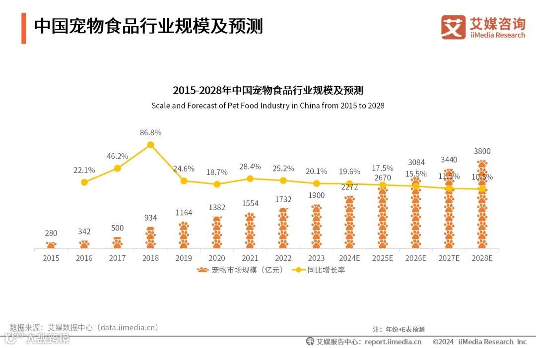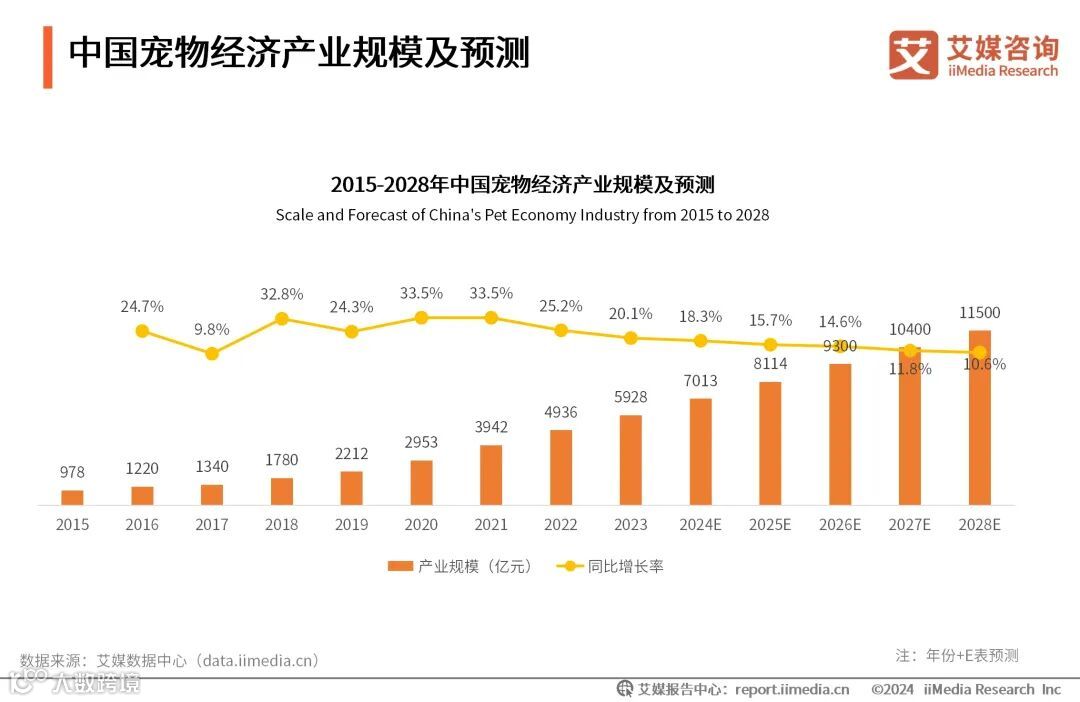 iiMedia Research(艾媒咨询)数据显示,2023年中国宠物经济产业规模达5928亿元,同比增长20.1%;2028年市场规模有望达到11500亿元。艾媒咨询分析师认为,随着人们对宠物角色的认知从情感寄托逐渐转变为家庭成员,他们在宠物身上的消费也在不断增加。这种趋势推动了宠物食品、用品、医疗、娱乐等各方面的消费增长,中国宠物经济产业将迎来广阔的增长空间。