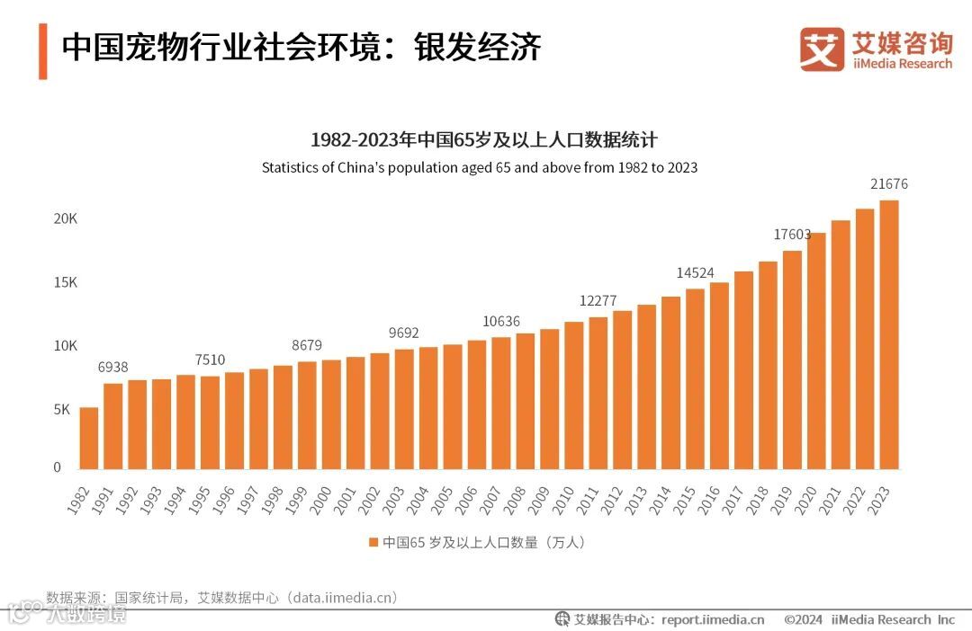 数据显示,自1982年以来,中国65岁及以上人口整体呈上升趋势,到2023年有21676万人。艾媒咨询分析师认为,许多老人由于子女不在身边,晚年生活比较孤独,养宠物可提高生活的幸福感。