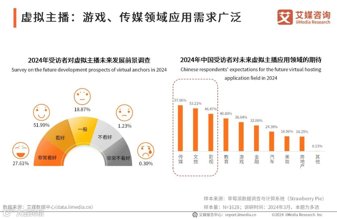 iiMedia Research(艾媒咨询)数据显示,超七成的受访者表示看好虚拟主播的未来发展;在应用领域方面,他们期望在未来能看到虚拟主播在传媒、文旅以及影视方面得到更多的应用。艾媒咨询分析师认为,随着虚拟主播行业的不断发展,它将进一步和人们的生活密切融合 。