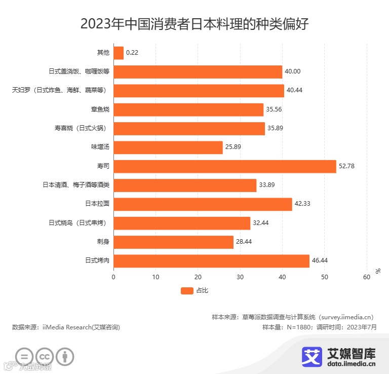 iiMedia Research(艾媒咨询)调研数据显示,寿司是日料消费者最偏爱的种类,占比达52.78%;此外,占比较高的有日式烤肉(46.44%)、日本拉面(42.33%)、天妇罗(40.44%)及日式盖浇饭(40.00%)等。