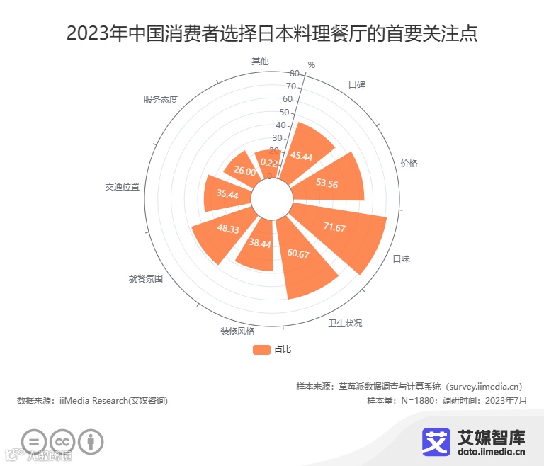 在选择日料餐厅时,消费者除了口味的选择外,最关注的因素之一是卫生状况(60.67%)。消费者会注意餐厅的整洁程度、食材的新鲜度、食品的储存和处理方式等方面,希望确保在用餐过程中不会因为卫生问题而担忧健康风险。