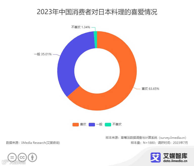 iiMedia Research(艾媒咨询)数据显示,在2023年中国消费者对日本料理的喜爱情况中,63.65%的消费者表示喜欢,35.01%的消费者表示一般,1.34%的消费者明确表示不喜欢。走上中国人餐桌多年的日本料理,目前已经为大众所广泛认知。