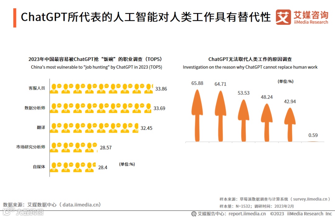 AIGC凭借较人工更高效的技术路径,对规模化内容的生产有较大冲击,对初级、通用型内容生产者具有取代性。调研数据显示,客服人员、数据分析师、翻译、市场研究分析师、自媒体五大职业是受访用户认为最容易被ChatGPT抢“饭碗”的。艾媒咨询分析师认为,ChatGPT所代表的人工智能会替代大部分简单、重复的常规工作。但人工智能更多的作用是提高人的效率、辅助人类,而创新能力、共情力、批判性思维等都是人类智能的体现,是人工智能都无法比拟的,人机协同将会是长期方向。