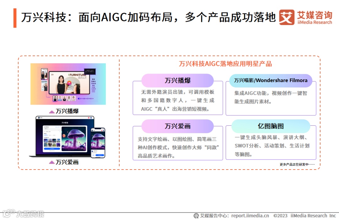 万兴科技面向AIGC加码布局,目前已于多个产品内落地虚拟人、AI智能抠像、AI智能降噪、AI音乐重组、AI换脸等功能,旗下万兴播爆(Wondershare Virbo)是全球领先的AIGC“真人”短视频出海营销神器。同时,万兴科技旗下视频创意软件万兴喵影、Wondershare Filmora已集成AIGC技术。此外,万兴科技还推出了全球首款交互型“图生图”AI绘画软件万兴爱画,当前产品已支持文字绘画、以图绘图、简笔画三种AI创作模式,而万兴科技旗下亿图脑图协同版也是脑图领域率先布局AIGC的产品。