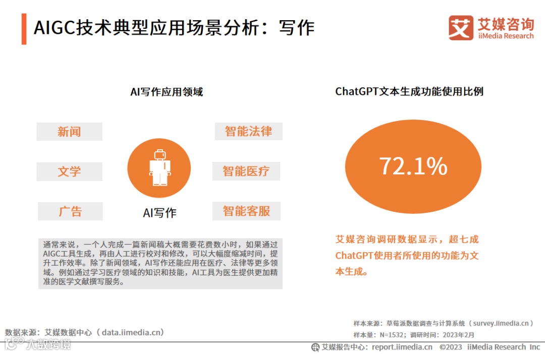 ChatGPT的火热在很大程度上提升了用户对AIGC的认知,对于AIGC应用普及与推广具有重要意义。调研数据显示,ChatGPT使用率最高的功能为文本生成,占比达72.1%。AI写作应用领域广泛,覆盖新闻、文学以及法律、医疗等专业知识领域。ChatGPT是人工智能产业链发展到一定阶段的必然产物,其背后揭示的其实是人工智能技术生成内容(AIGC)所带来深刻的生产力变革。随着人工智能技术的发展,AI智能写作将会愈发个性化,融合更多的知识和技能,为用户提供更加丰富、多样化、个性化的写作服务。