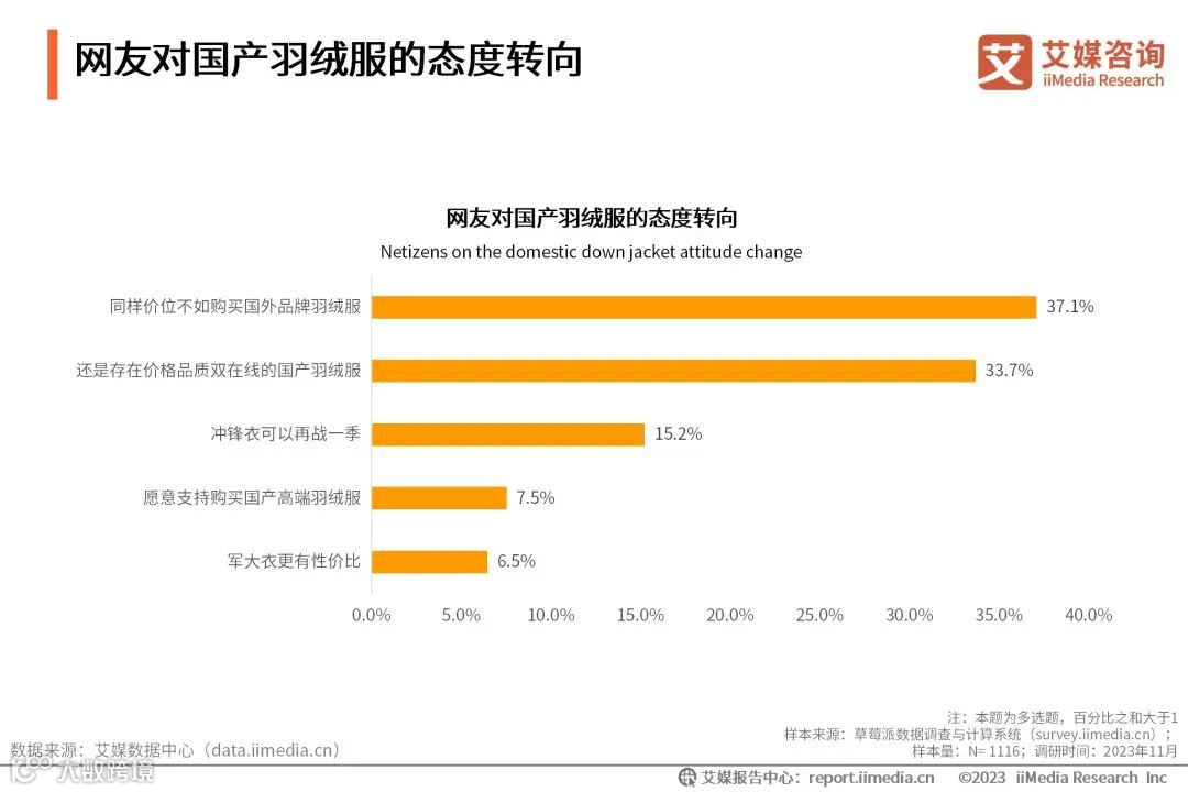 iiMedia Research(艾媒咨询)调研数据显示,经“国产羽绒服”舆论事件发酵后,网友对国产羽绒服态度发生转变。37.1%的网友认为同样价位不如买国外羽绒服品牌;33.7%的网友认为还是存在价格品质双在线的国产羽绒服。