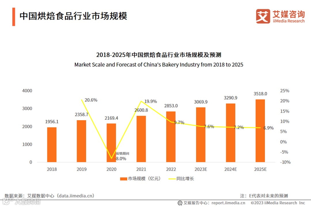 根据艾媒咨询发布的《2023年中国烘焙食品行业现状及趋势研究报告》数据显示,2022年中国烘焙食品行业市场规模达2853亿元,同比增长9.7%。随着人均消费水平的增长及餐饮消费结构调整,中国烘焙食品行业消费需求旺盛,上下游产业快速发展,市场将进一步扩容,预计2025年市场规模将达3518亿元。